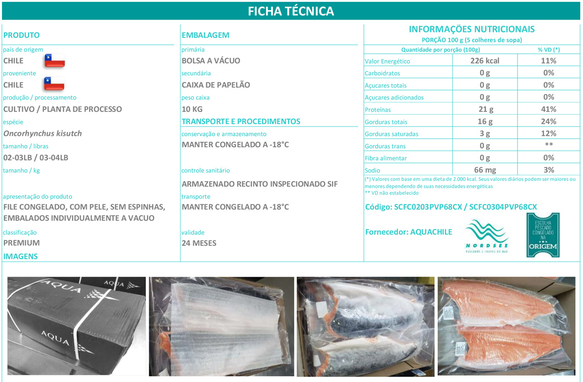 - Apresentação: filé congelado, com pele, sem espinhas, embalado individualmente em bolsa a vácuo, matéria-prima que não pode faltar em seu negócio!